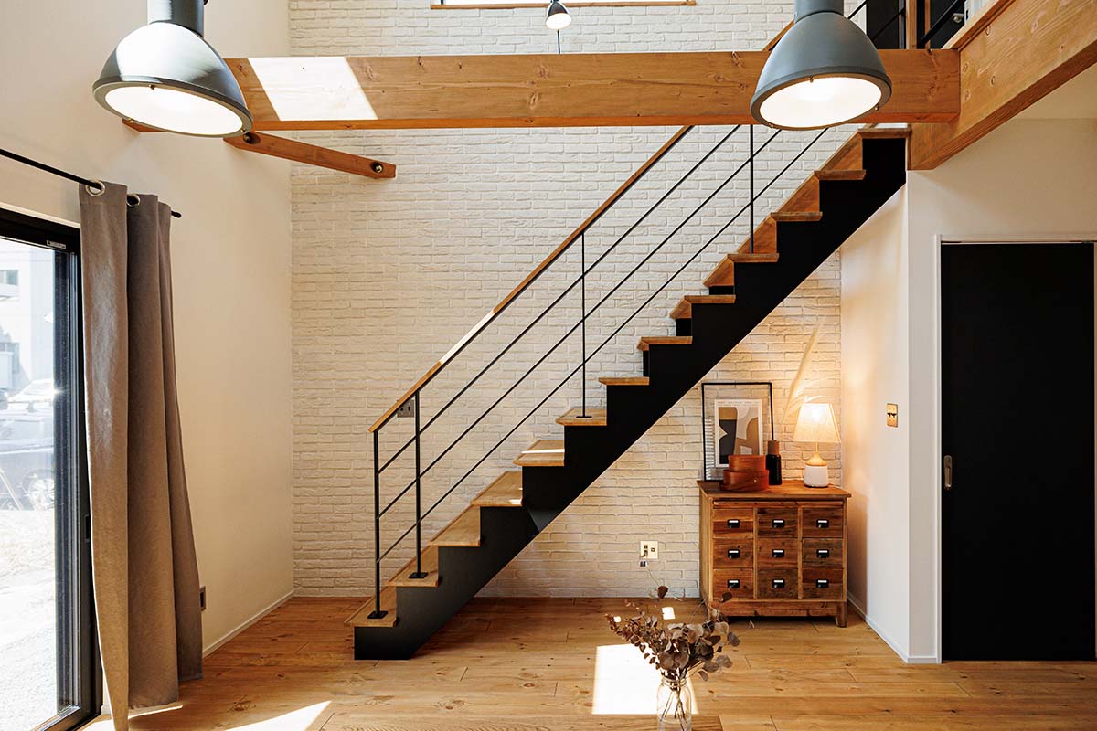 床材には、こだわりの幅広に仕上げた無垢のパイン材をセレクト。一枚一枚、手作業で張り込んだホワイトブリックタイルの壁面に、ハンドメイドの鉄骨階段がグッときます。
