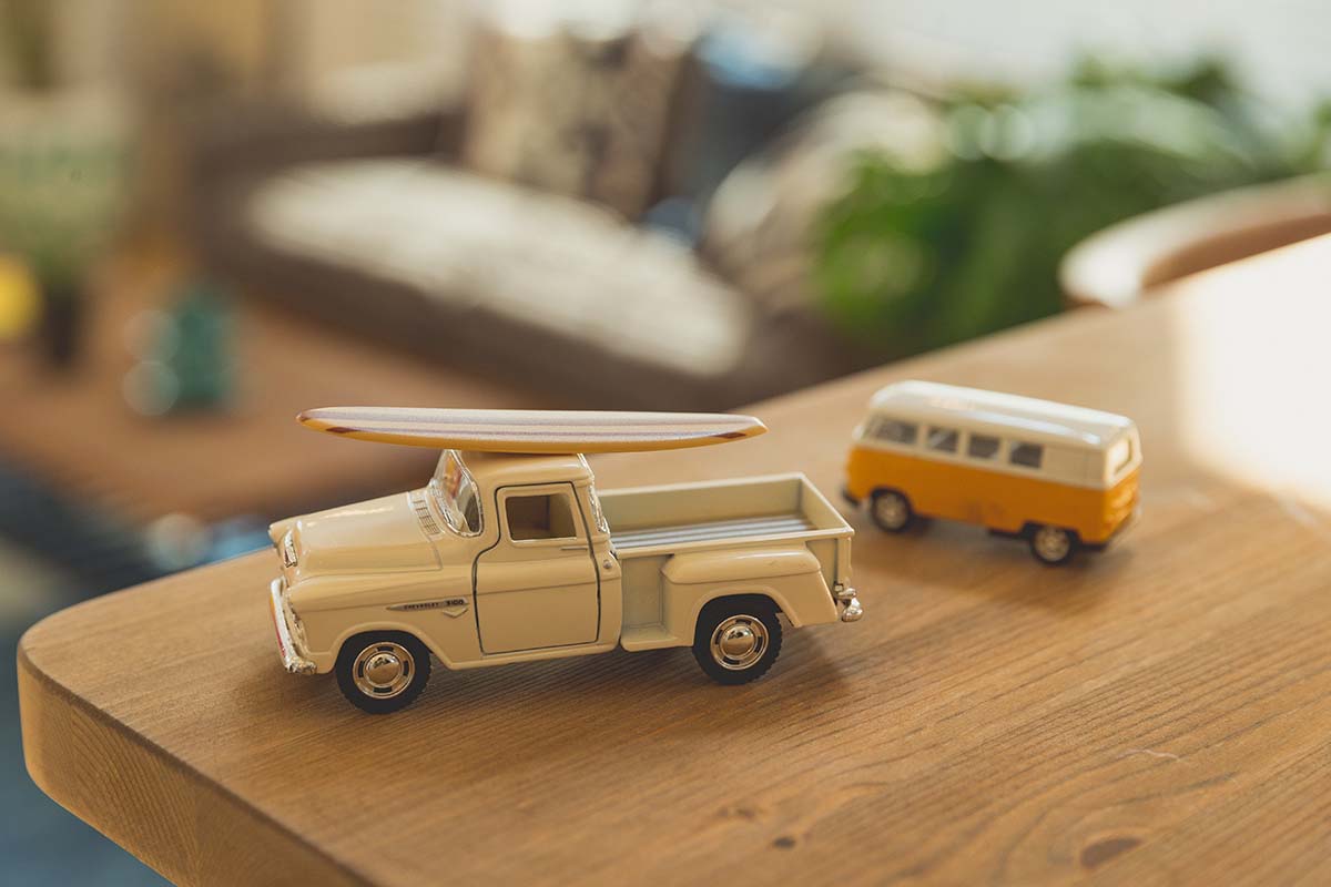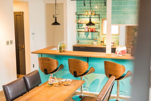インテリアのコーディネートは、デニム使いや、ヘリンボーンの板張りの内装仕上げなど西海岸スタイルならでは。