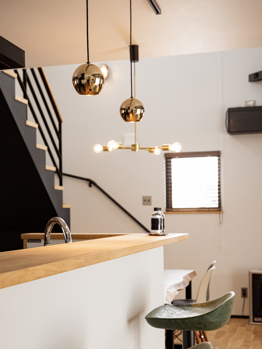 ・アクセントにゴールドの素材感の照明を使用し、クラシックかつ格好よく
