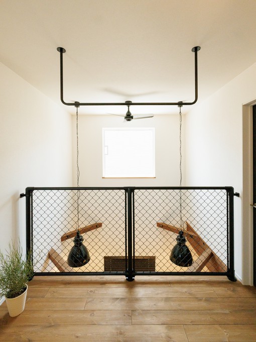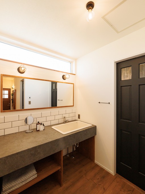 ご夫婦ともにブルックリンやインダストリアルな世界観がお好み。玄関を入るとリビングが見えるパーテーションを造作し、広々とした空間を演出しています。露出配管やトグルスイッチ、アイアン脚の洗面を取り入れ、全体的に男前なテイストを実現。シューズクロークやキッチン背面収納、テレビボードにはスチール素材の置き家具を使用し、カフェのような雰囲気。