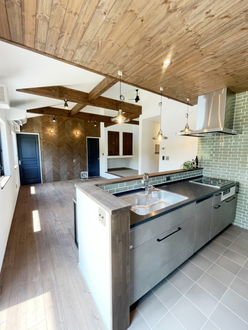 ・ヘリンボーンやタイル、天井に羽目板など、随所にアクセントをつけてデザイン性の高い住宅に。