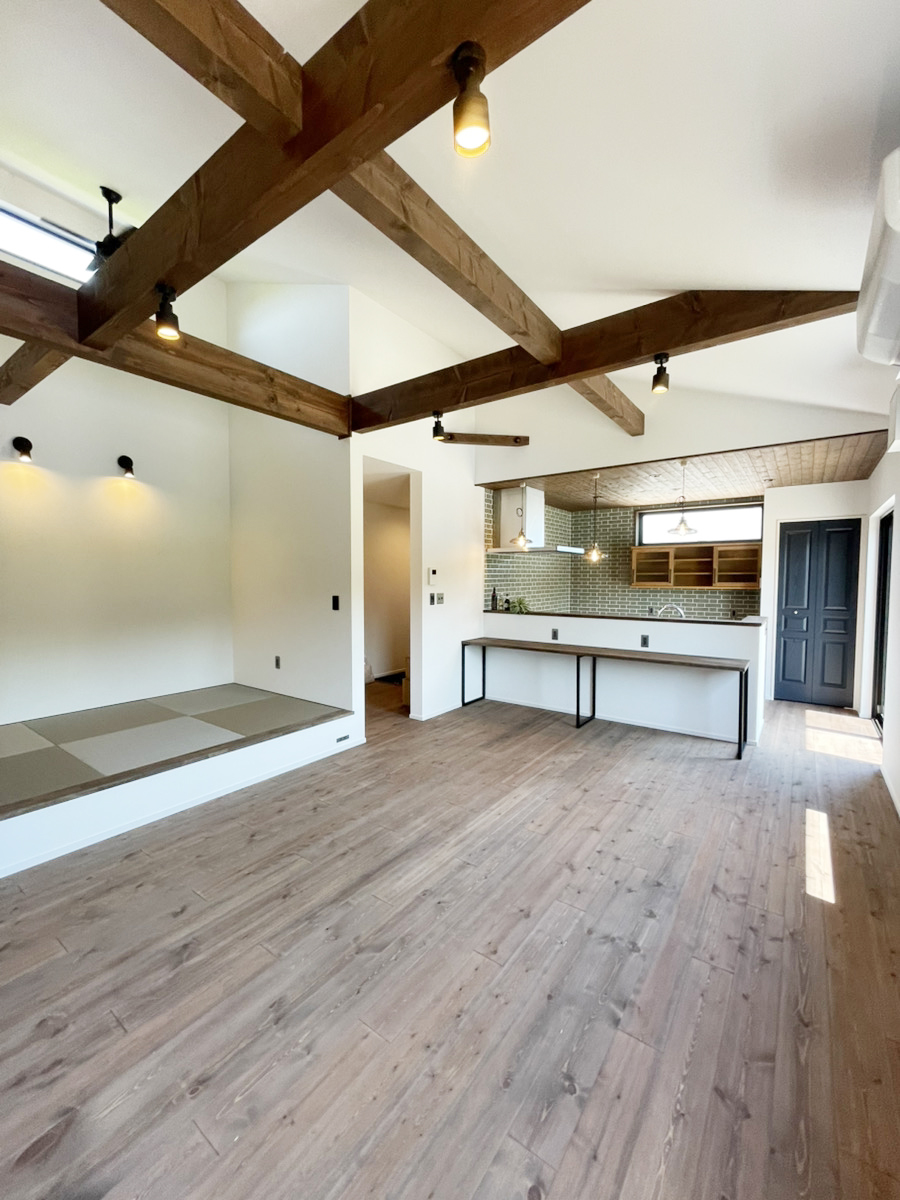・開放感のある勾配天井と梁見せのLDKで天井が高く梁を見せる設計で空間が広く感じられる。