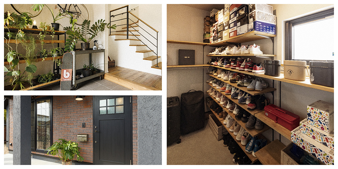 広い玄関土間には大容量のシューズ収納を備え、登山や温泉巡りの趣味を収納を豊富に設置。