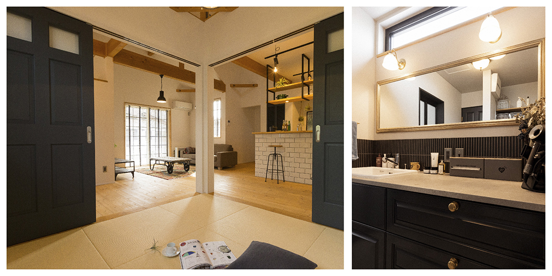 リビングには段差のない3畳の畳スペースを設け、ブルックリンの風合いに和の落ち着きをひとさじ。