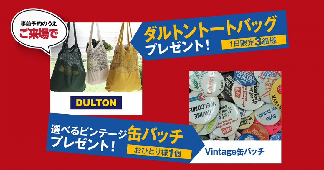 ※ダルトントートバックは1日限定3組様。缶バッチはお1人様1個、無くなり次第終了。