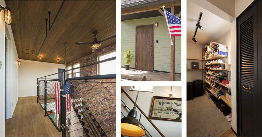 吹き抜けに面したホールには、アメリカンフェンスと造作の鉄骨手摺を採用。