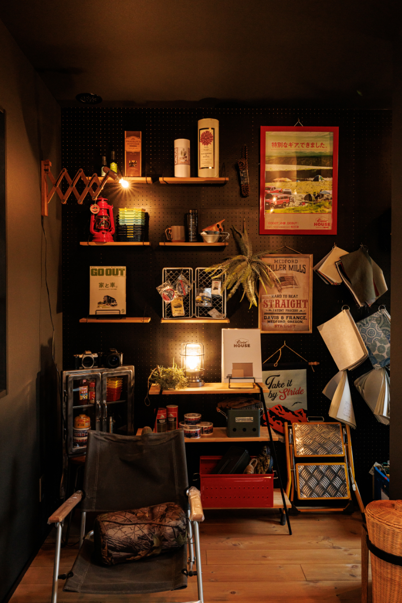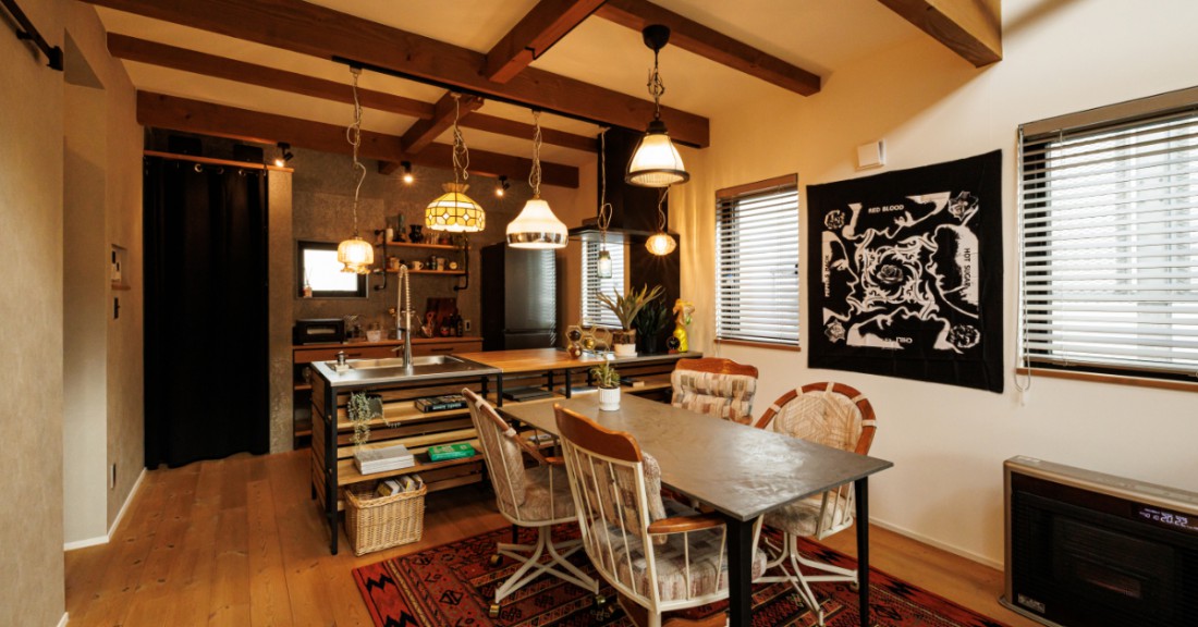 吹き抜けのあるリビングは、明るく冬でも陽だまりに包まれ、パイン材の無垢床がやさしい温もりを感じさせす。アイアンフレームのキッチンなど、カッコよさと落ち着きの両立した空間です。2階にはアウトドアテイストの個室や各素材のショールームもあります。